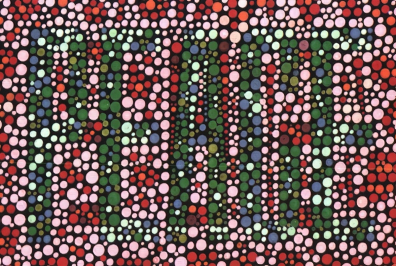 第一幅图,大家首先看一下,这幅图是两个阿拉伯数字,他是绿色的圆点组成,如果大家不能够识别出来的话,那就是绿色色弱!