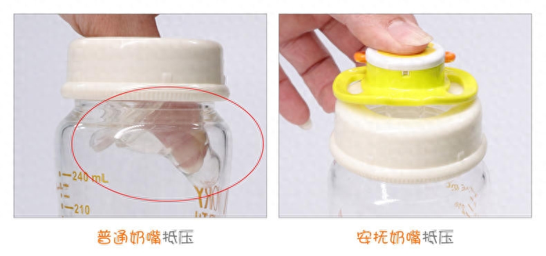 测评方式:取奶瓶一个,分别将奶瓶奶嘴与安抚奶嘴倒置放在奶瓶口,手指用力向奶瓶内抵压,查看两款奶嘴是否被抵压入奶瓶