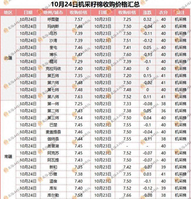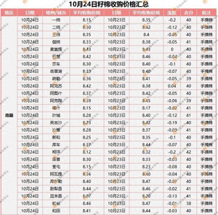 10月24日,新疆籽棉价格持续下跌。南疆一师的平均收购价格为8.15元,较昨日下跌0.2元;二师的平均收购价格为8.30元,较昨日下跌0.12元;三师的平均成交价格为8.35元,较昨日下跌0.05元。北疆七师的平均成交价格为8.20元,较昨日下跌0.12元;哈密的平均成交价格为8.50元,较昨日下跌0.06元。机采棉价格连续下跌数日,但部分地区出现上涨。南疆一师的价格为7.25元,下跌0.08元;二师的价格为7.43元,上涨0.05元;巴楚的价格为7.45元,下跌0.1元。北疆呼图壁的价格为7.57元,上涨0.32元;玛纳斯的价格为7.46元,下跌0.04元;乌苏的价格为7.39元,下跌0.11元。棉花期货方面,10月24日,ICE棉花期货收涨,成交量和持仓量均有所减少。