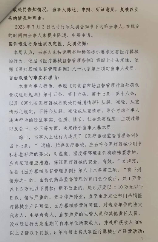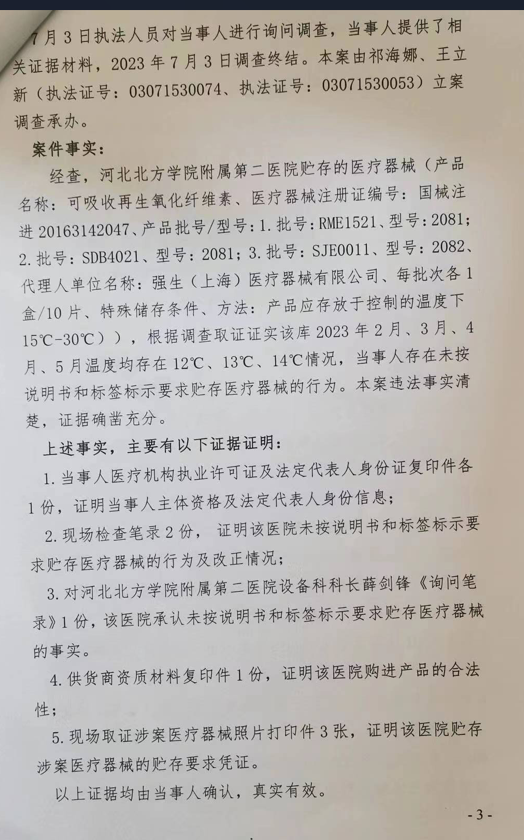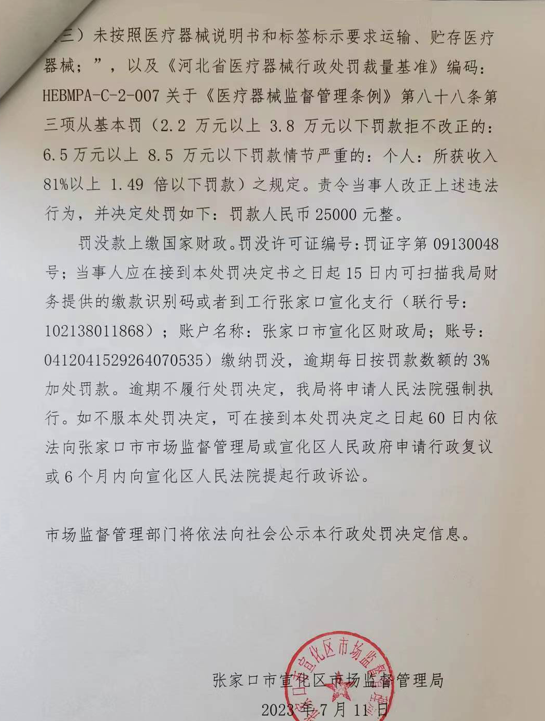 未按要求贮存医疗器械,河北北方学院附属第二医院被罚2.5万 2023-12-04 寻医问药 19566 作者:贝莱孕育 张家口市宣化区人民政府网站19日发布行政处罚信息,河北北方学院附属第二医院未按说明书和标签标示要求贮存医疗器械被罚款2.5万元。行政处罚决定书如下: