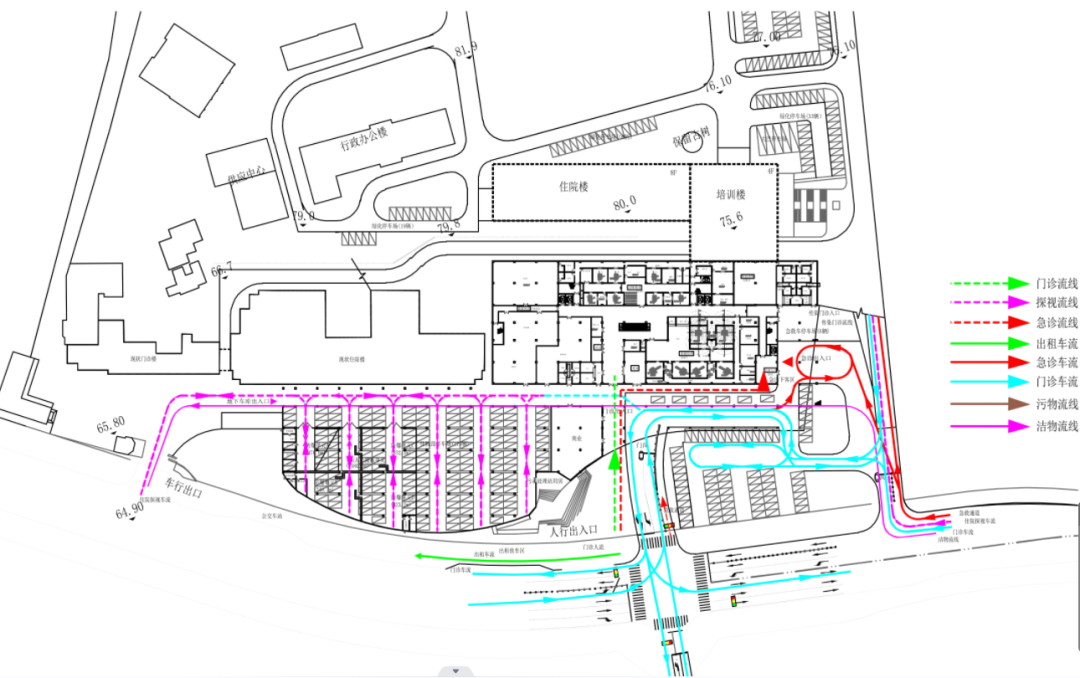 院区前广场通过架空层设计,设置两层停车,通过合理设计车行流线,有效解决医院就诊高峰的交通拥堵问题,且停车区域均能快速到达门急诊就诊区。