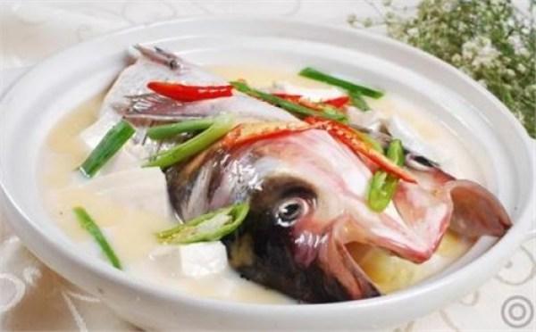 胖头鱼鱼头500克去鳃,劈开两半;取青蒜15克切段;豆腐300克和香菇50克切片:锅置火上,放入鱼头、香菇、葱段10克、姜片5克、料酒30克和鲜汤,烧沸以后撇去浮沫;小火炖至鱼头快熟时,捡去葱和姜;之后加入豆腐炖至熟烂;撒入精盐8克、味精、胡椒粉和青椒段稍顿片刻即可。